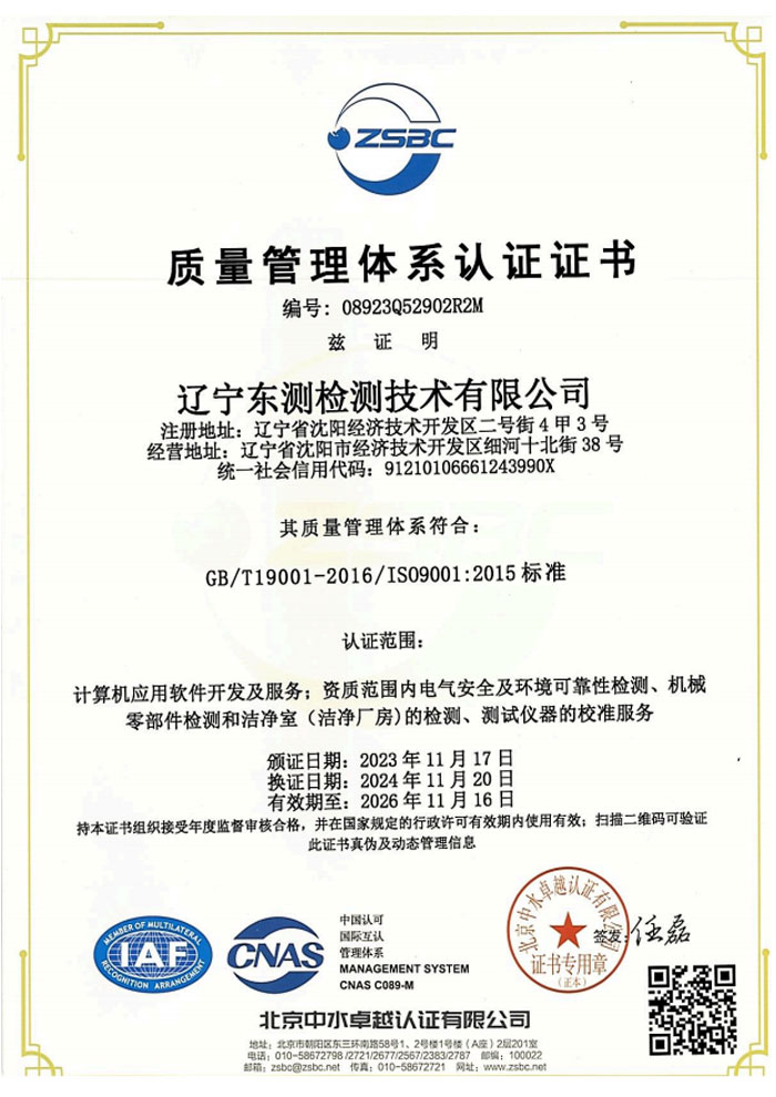 遼寧東測檢測技術有限公司成立于2007年6月21日,專注于為客戶提供計量、檢測以及技術咨詢與培訓的第三方計量檢測機構。遼寧東測檢測技術有限公司通過了中國合格評定國家認可委員會認可(CNAS),獲得檢驗檢測機構資質認定(CMA),憑借著高效的服務網絡、雄厚的技術實力以及全面的業務范圍,本著“科學、公正、準確、真誠”的質量方針,為社會提供優質計量檢測服務,打造國內具有價值的計量技術機構。